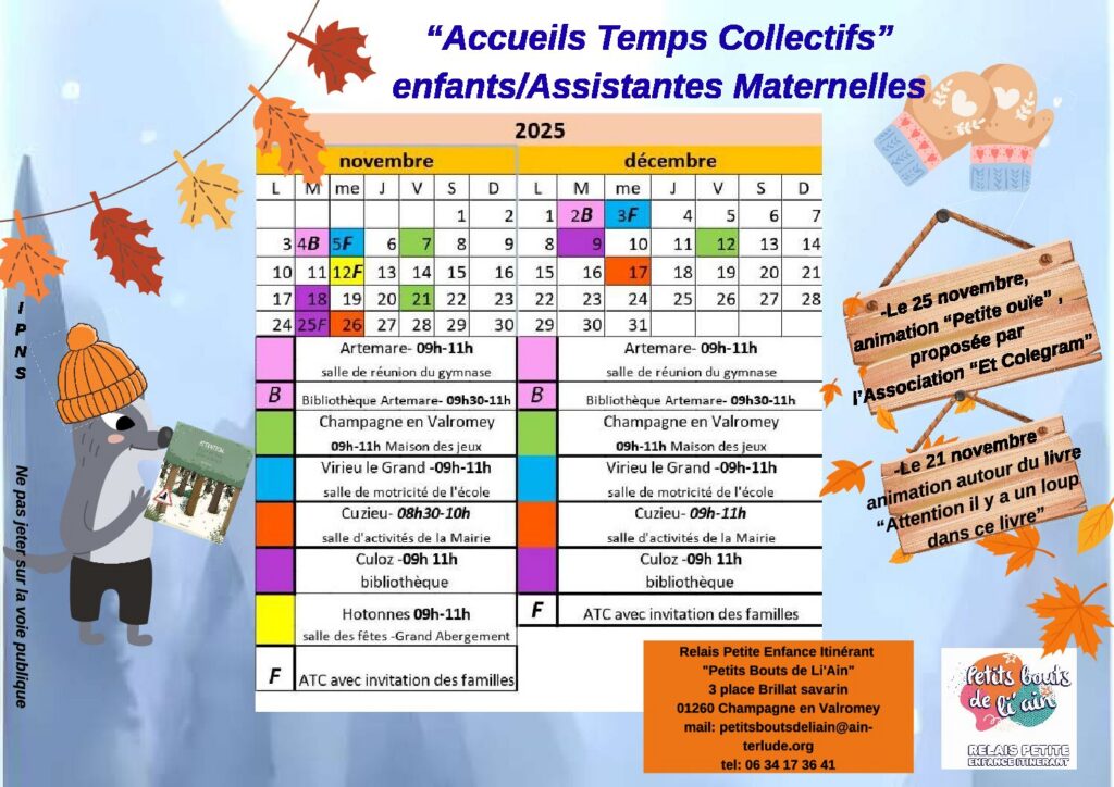 Accueils de Temps Collectifs Les rendez-vous de novembre et décembre 2025 -Accueils de Temps Collectifs mensuels à destination des Assistantes Maternelles, Gardes à Domicile et des enfants qu’elles accueillent. Le Relais Petite Enfance est itinérant et tournent sur les communes suivantes: Champagne ou Hotonnes pour le SIVOM, Culoz, Virieu le Grand, Artemare et Cuzieu. Accueils […]